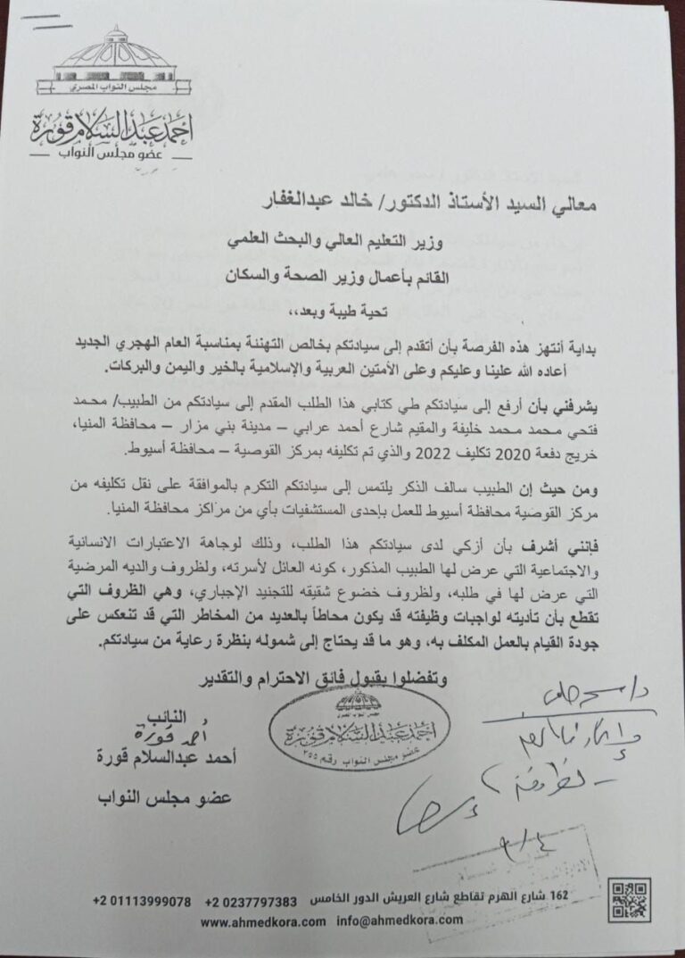 طلب نقل تكليف الطبيب / محمد فتحي محمد خليفة